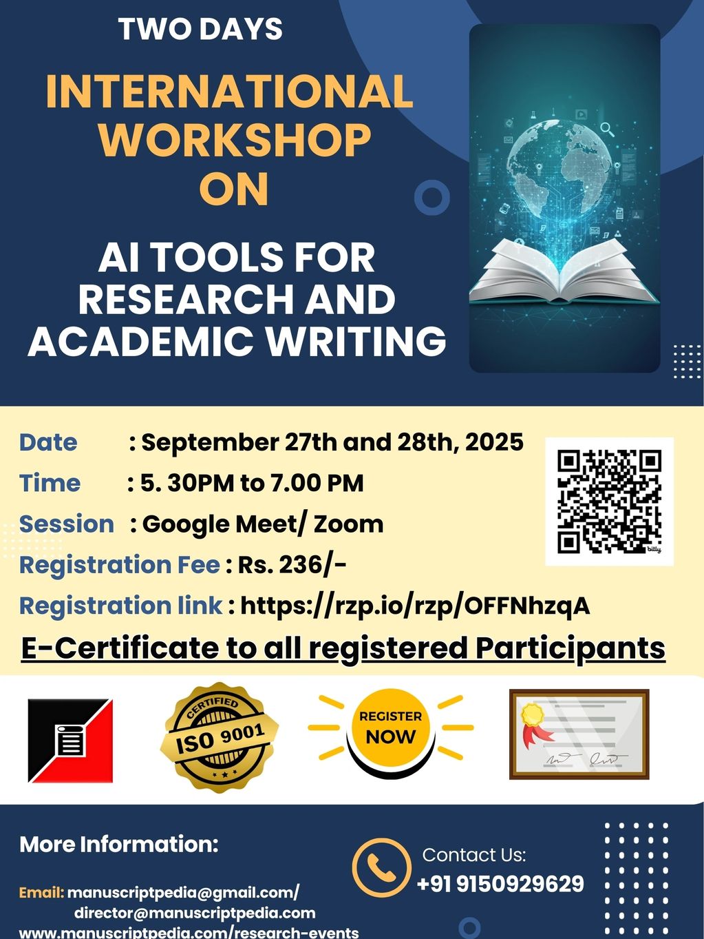 Greetings from Manuscriptpedia an ISO 9001:2015 certified registered research firm, conducting an International workshop on “AI Tools for Research Writing"